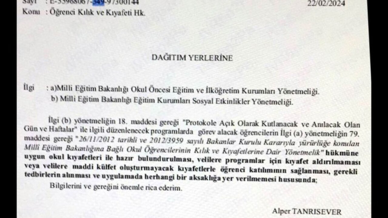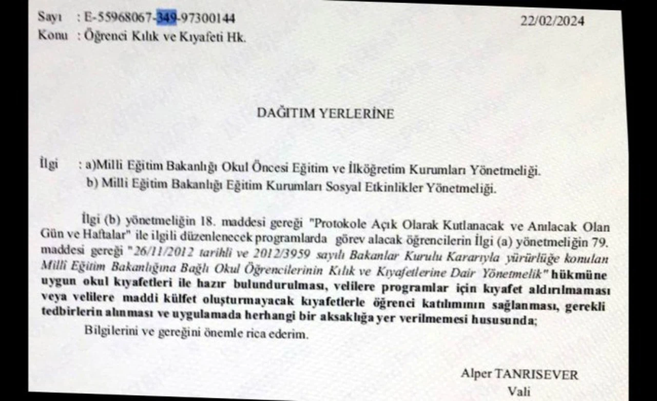 Gümüşhane Valisi Alper Tanrısever imzasıyla yayınlanan yazıda, şunlar kaydedildi: “Milli Eğitim Bakanlığı Eğitim Kurumları Sosyal Etkinlikler Yönetmeliğinin 18. Maddesi gereği “Protokole Açık Olarak Kutlanacak ve Anılacak Olan Gün ve Haftalar” ile ilgili düzenlenecek programlarda görev alacak öğrencilerin Milli Eğitim Bakanlığı Okul Öncesi Eğitim ve İlköğretim Kurumları Yönetmeliği’nin 79. Maddesi gereği “26/11/2012 tarihli ve 2012/3959 sayılı Bakanlar Kurulu Kararıyla yürürlüğe konulan Milli Eğitim Bakanlığına Bağlı Okul Öğrencilerinin Kılık ve Kıyafetlerine Dair Yönetmelik” hükmüne uygun okul kıyafetleri ile hazır bulundurulması, velilere programlar için kıyafet aldırılmaması veya velilere maddi külfet oluşturmayacak kıyafetlerle öğrenci katılımının sağlanması, gerekli tedbirlerin alınması ve uygulamada herhangi bir aksaklığa yer verilmemesi hususunda,  Bilgilerini ve gereğini önemle rica ederim”