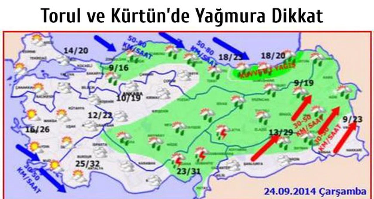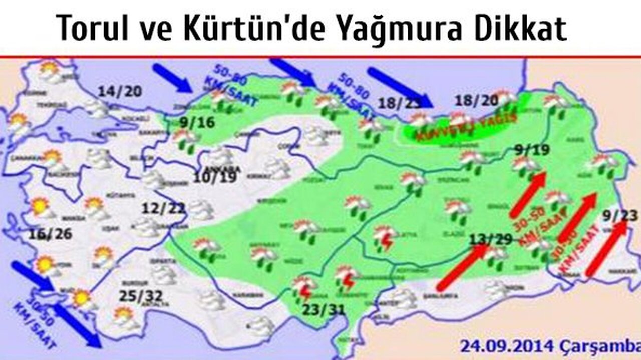 Yapılan son değerlendirme ve analizlere göre özellikle Torul ve Kürtün bölgesinde etkili olması beklenen yağış nedeniyle bugün akşam saatlerine doğru İç Anadolu'nun doğusu ile gece saatlerinden itibaren Doğu Anadolu'nun kuzeyi, Orta ve Doğu Karadeniz'de güney ve güney batılı, yarın (Çarşamba) sabah saatlerinden itibaren Orta ve Doğu Karadeniz'de batı ve kuzeybatı yönlerden esecek rüzgarın kuvvetli yer yer kısa süreli fırtına şeklinde esmesi beklendiğinden yaşanabilecek çatı uçması, ağaç veya direklerin devrilmesi ve ulaşımda aksamalar olumsuzluklara karşı dikkatli ve tedbirli olunması istendi.