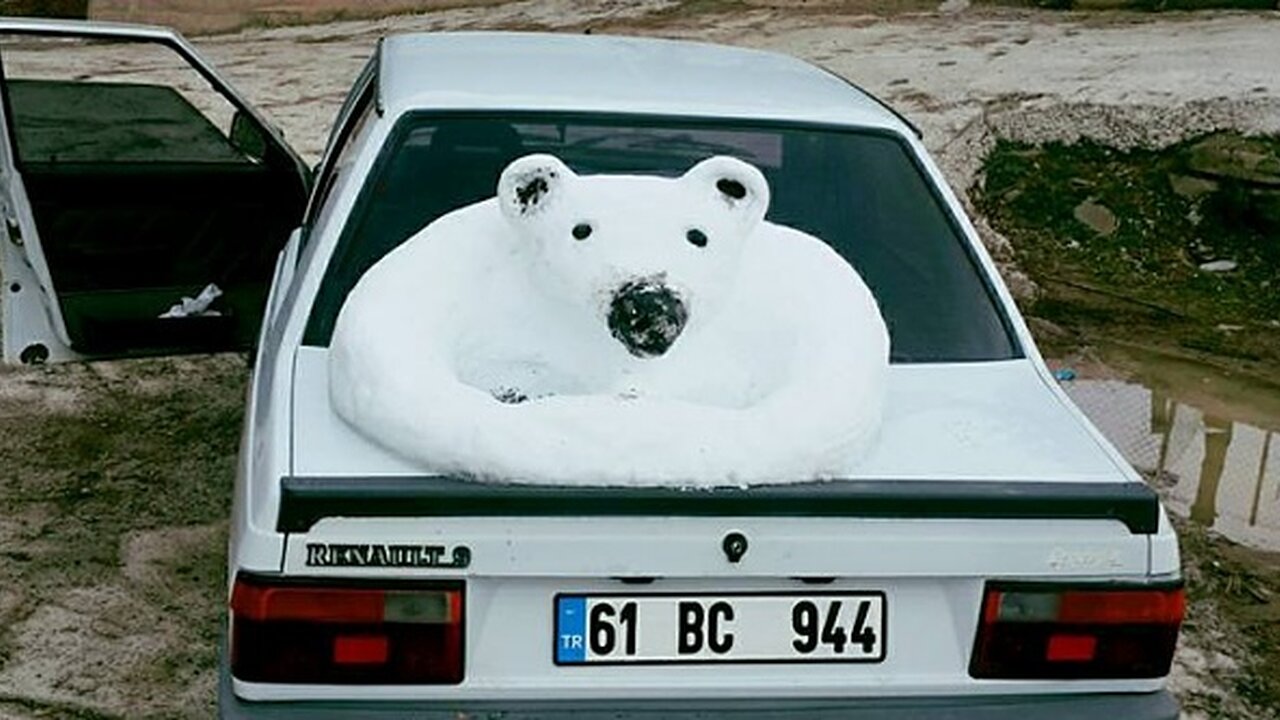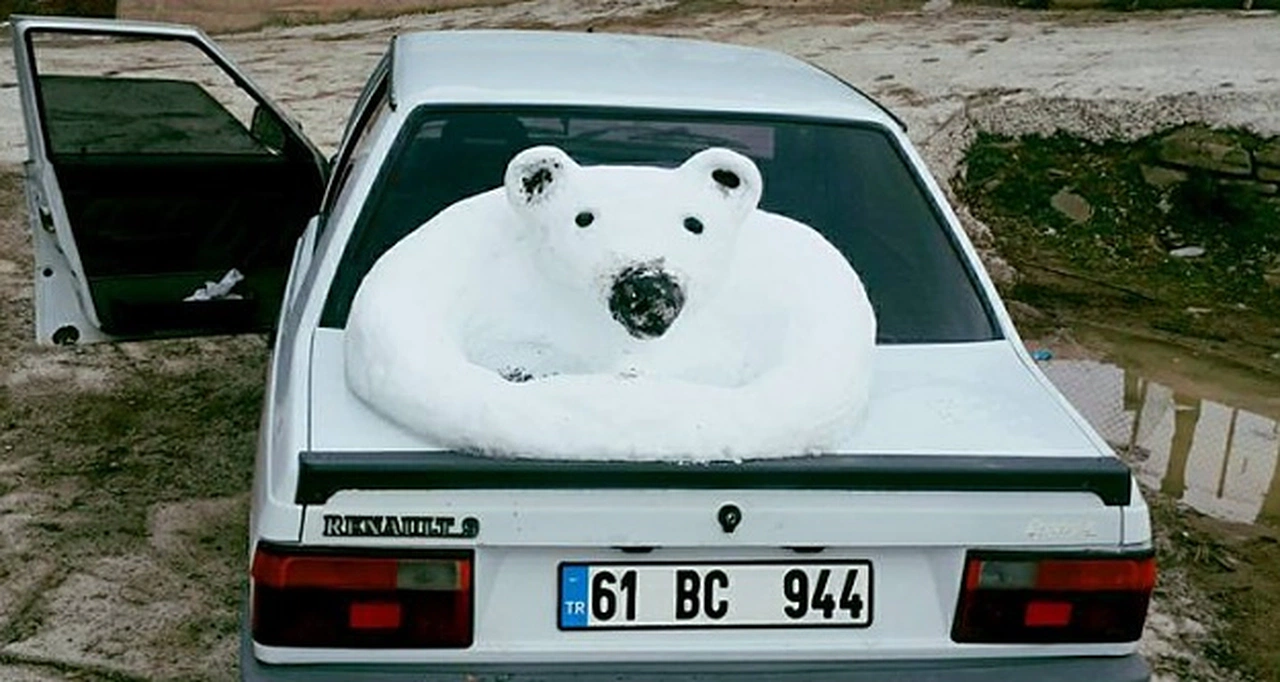 Geçtiğimiz günlerde gerçekleşen kar yağışının ardından yerde istediği gibi kar birikintisi bulamayan Oral, pratik zekasını kullanarak aracının üzerinde biriken ve gölgede olması nedeniyle erimeyen kardan kutup ayısı heykeli yaptı.
