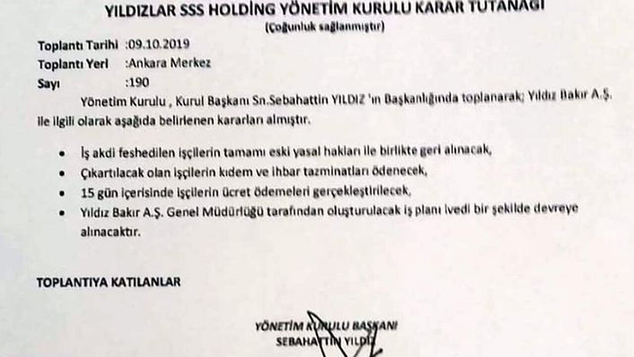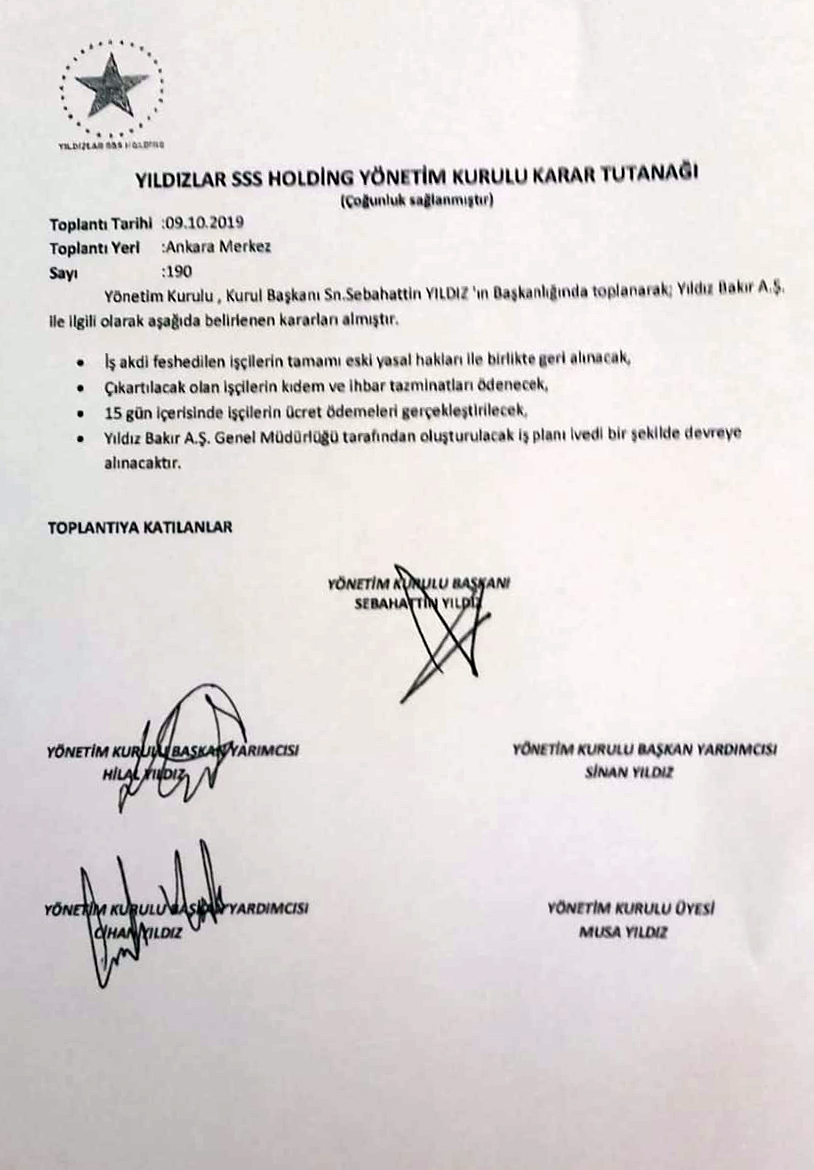 Yönetim Kurulu başkanı Sebahattin Yıldız başkanlığında toplanan şirket yönetimi aldığı kararla işçilerin maaşının 15 gün içerisinde ödenmesini, iş akdi feshedilen işçilerin tamamının eski yasal haklarıyla birlikte geri alınmasını, çıkarılacak işçilerin ihbar ve kıdem tazminatlarının ödenmesini, Yıldız Bakır A.Ş. Genel Müdürlüğü tarafından oluşturulacak iş planının ivedi bir şekilde devreye alınmasını kararlaştırdı.