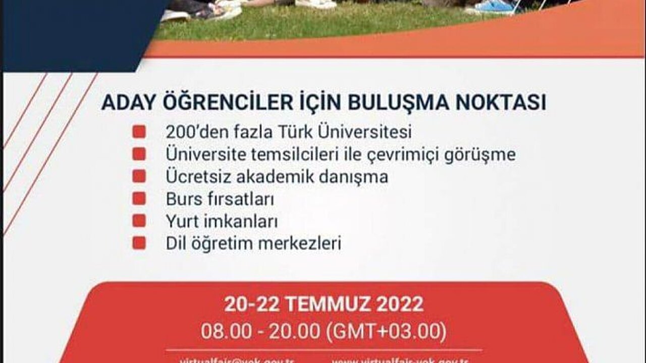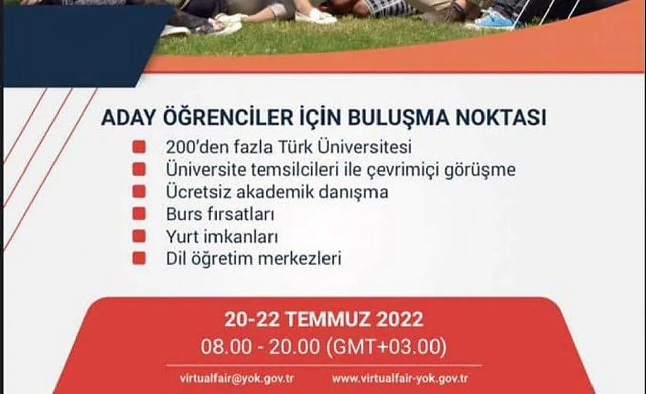 Üçüncüsü gerçekleştirilecek “Study in Turkey YÖK Virtual Fair” başlıklı etkinlik 20-22 Temmuz 2022 tarihlerinde virtualfair-yok.gov.tr internet adresi üzerinden başlayacak.