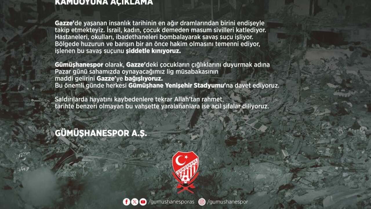 Tarihte eşi benzeri olmayan bu vahşette yaralananlara acil şifa, hayatını kaybedenlere de Allah’tan rahmet dilenen açıklamada kulüp olarak Gazze'deki çocukların çığlıklarını duyurmak adına Pazar günü sahalarında oynanacak lig müsabakasının maddi gelirini Gazze'ye bağışlayacaklarını aktaran kulüp yönetimi bu önemli günde herkesi Gümüşhane Yenişehir Stadyumu'na davet etti.