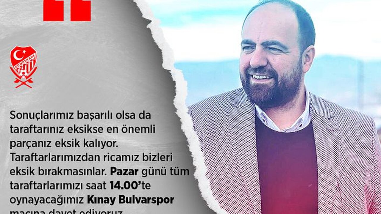 Yakut, açıklamasının sonunda, sporun en önemli parçasının taraftar olduğuna değinerek “Sonuçlarımız başarılı olsa da taraftarınız eksikse en önemli parçanız eksik kalıyor. Taraftarlarımızdan ricamız bizleri eksik bırakmasınlar. Pazar günü tüm taraftarlarımızı saat 14:00’te oynayacağımız Kınay Bulvarspor maçına davet ediyoruz” ifadelerini kullandı.