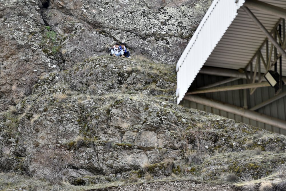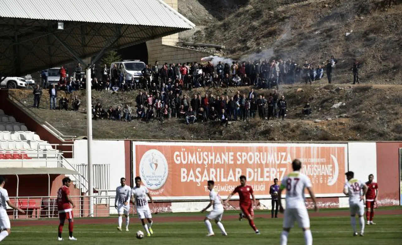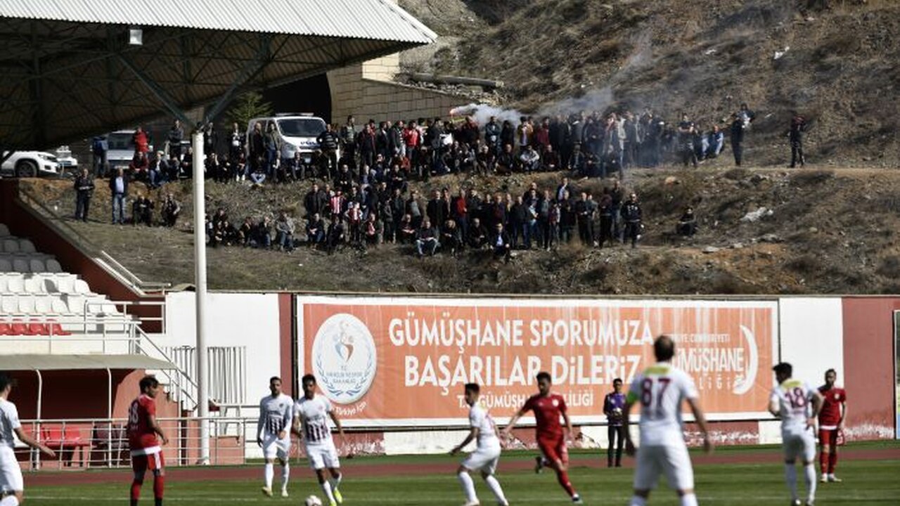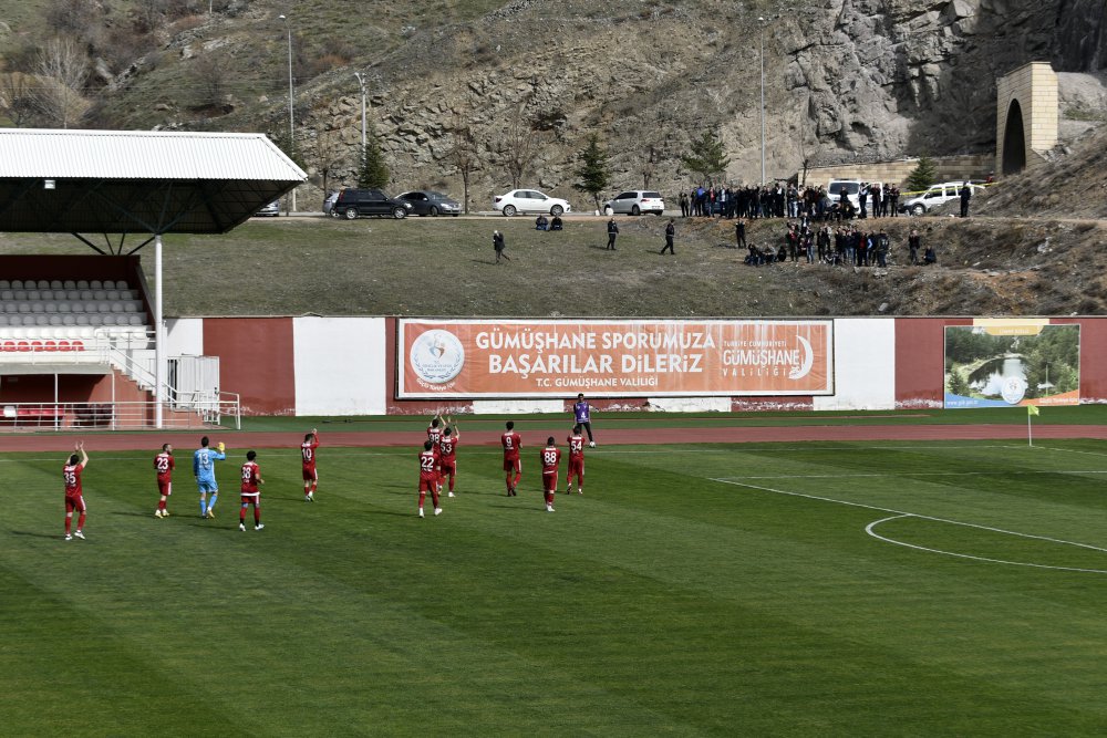 Yasak nedeniyle stadyumun dağ tarafındaki boşlukları ve kayalıkların üzerlerini doldurarak takımını destekleyen yaklaşık 100 Gümüşhanespor taraftarı havanın güzel olmasından da faydalanarak müsabakayı izledi.