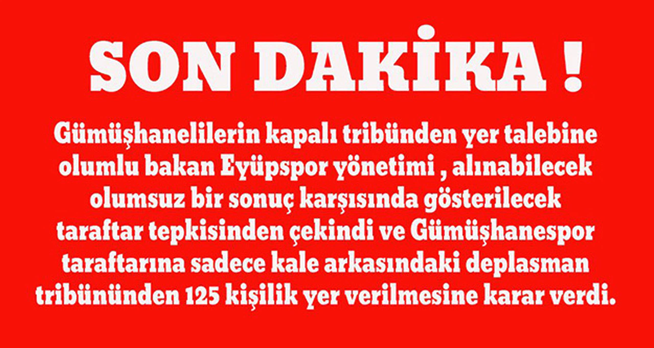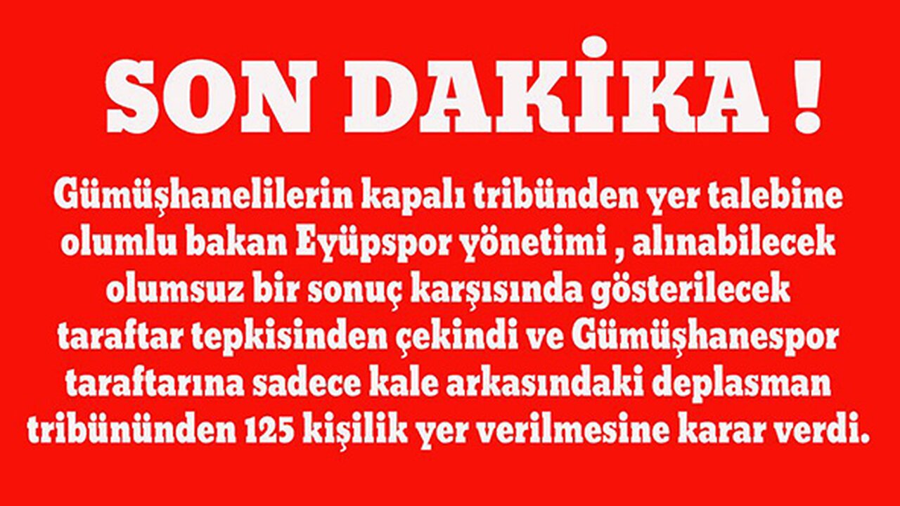 Hafta başında Gümüşhanesporlu taraftarların maçlarda boş kalan kapalı tribünün deplasman tribününe yakın kısmındaki 800 kişilik kısım için yaptığı talep, yöneticilerin Eyüpspor taraftarlarının tepkisinden çekinerek vermek istememesi Gümüşhanesporlu taraftarları hem üzdü hem de tepkisini çekti.
