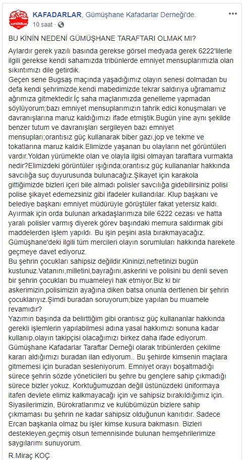 Gümüşhane Kafadarlar Taraftar Derneği olarak tribünlerden çekilme kararı aldıklarını dile getiren Koç, “Bu şehirde kimsenin maçlara gitmemesi için buradan sesleniyorum. Emniyet orayı boşaltmadığı sürece şehrin sözde yöneticileri bu şehre bu gençlere sahip çıkmadığı sürece bizler yokuz. Korktuğumuzdan değil üstünüzdeki üniformaya ithafen devlete elimiz kalkmayacağı için ve sahipsiz bırakıldığımız için. Siyasilerimizin, bürokratlarımız ve kulübümüzün bizlere sahip çıkmaması bu şehrin ne kadar sahipsiz olduğunun kanıtıdır. Sadece Ercan başkanla olmaz bu işler kimse kusura bakmasın. Bizleri destekleyen, geçmiş olsun temennisinde bulunan hemşehrilerimize saygılarımı sunuyorum” ifadelerini kullandı.