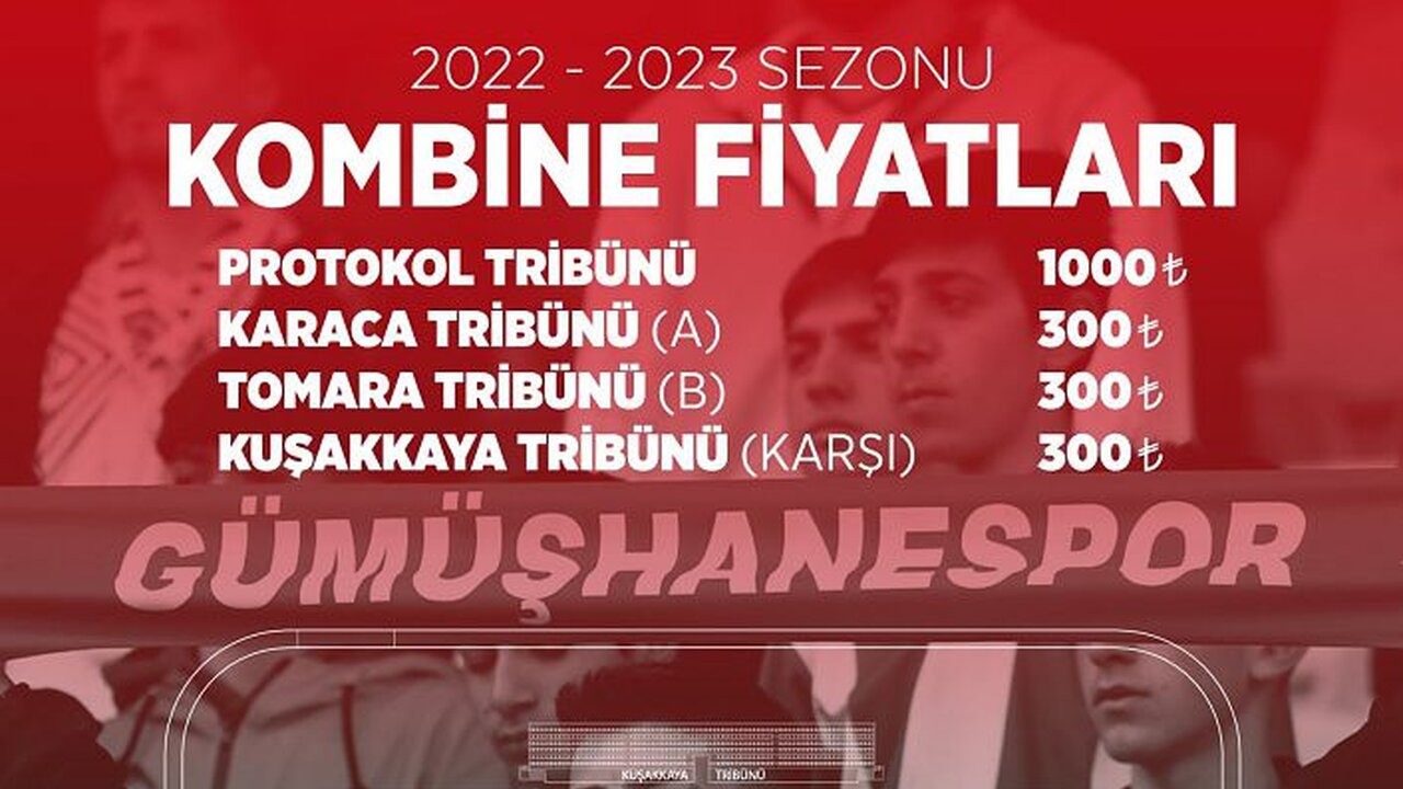 Kırmızı-beyazlı temsilcimizde kombine kartlardan Şeref Tribünü 1.000 TL, Gümüşhane tarafındaki Tomara (FUAT YALÇINKAYA) Tribünü 300 TL, dere tarafındaki Karaca Tribünü 300 TL ve tünel tarafındaki Kuşakkaya Tribünü 300 TL olarak belirlendi.