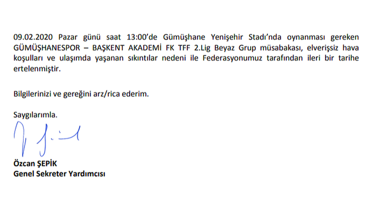 Hem kulüplere hem de diğer ilgili makamlara TFF tarafından Genel Sekreter Yardımcısı Özcan Şepik imzasıyla gönderilen yazıda "09.02.2020 Pazar günü saat 13:00’de Gümüşhane Yenişehir Stadı’nda oynanması gereken GÜMÜŞHANESPOR – BAŞKENT AKADEMİ FK TFF 2.Lig Beyaz Grup müsabakası, elverişsiz hava koşulları ve ulaşımda yaşanan sıkıntılar nedeni ile Federasyonumuz tarafından ileri bir tarihe ertelenmiştir" ifadeleri kullanıldı.