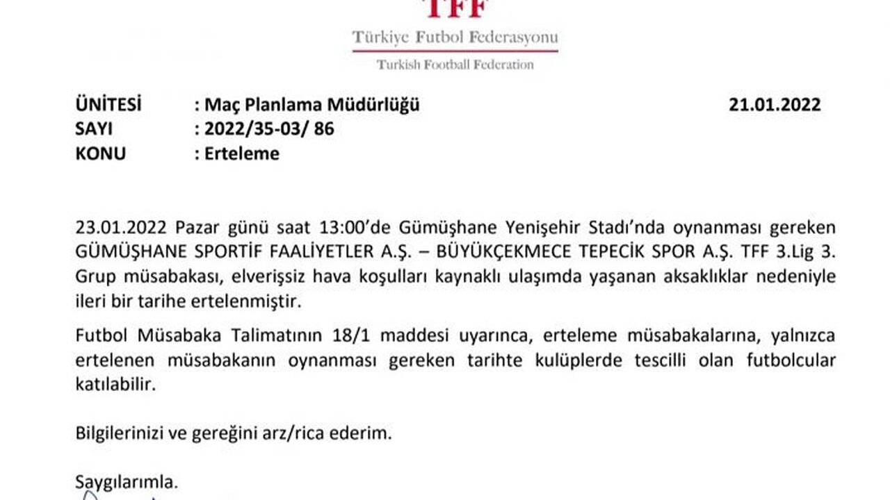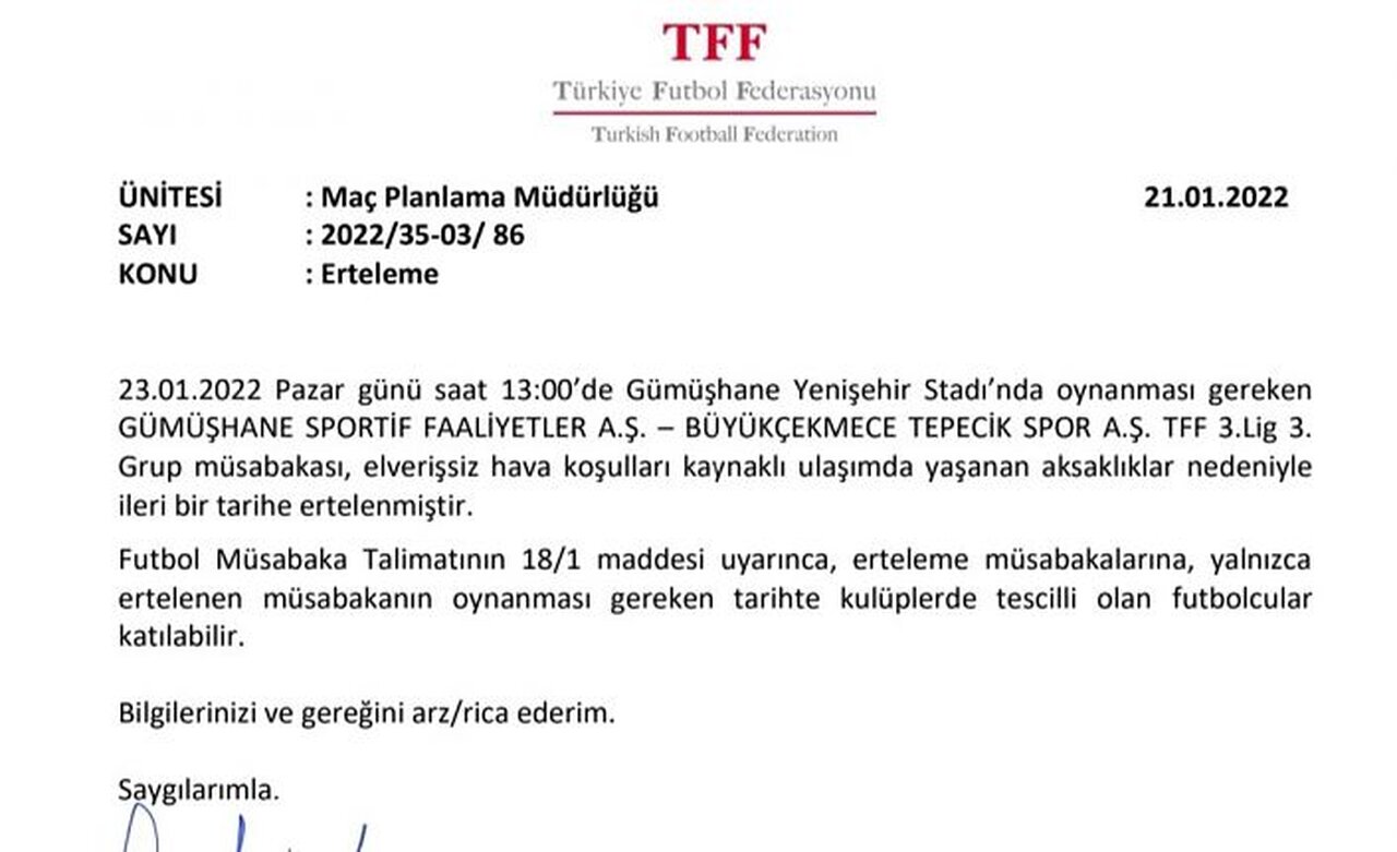 Türkiye Futbol Federasyonu (TFF) Maç Planlama Müdürlüğü tarafından yapılan açıklamada 23 Ocak Pazar günü saat 13.00'da Gümüşhane Yeni Şehir Stadında oynanması gereken 19.hafta müsabakası elverişsiz hava koşulları kaynaklı ulaşımda yaşanan aksaklıklar nedeniyle ileri bir tarihe ertelendiği ifade edildi.