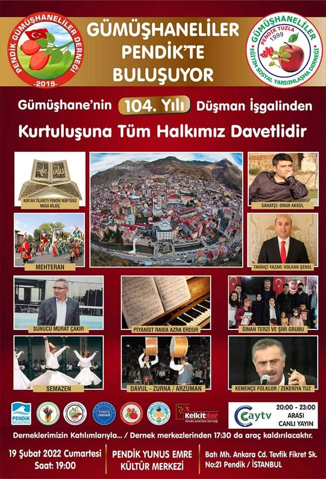 19 Şubat Cumartesi günü saat 19.00'da Pendik Yunus Emre Kültür Merkezinde gerçekleştirilecek etkinlik Pendik Gümüşhaneliler Derneği ve Pendik Tuzla Gümüşhaneliler Eğitim Sosyal Yardımlaşma Derneği tarafından düzenlenecek.