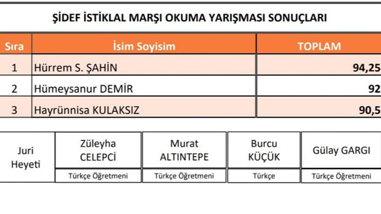 Jüri heyetinin yaptığı değerlendirme sonucunda Hürrem S.Şahin birinci, Hümeysanur Demir ikinci ve Hayrünnisa Kulaksız üçüncü oldu. 10 kıtanın ezbere okunduğu yarışma sonucunda birinciye tablet, ikinciye akıllı saat ve üçüncüye hediye çeki verilecek.