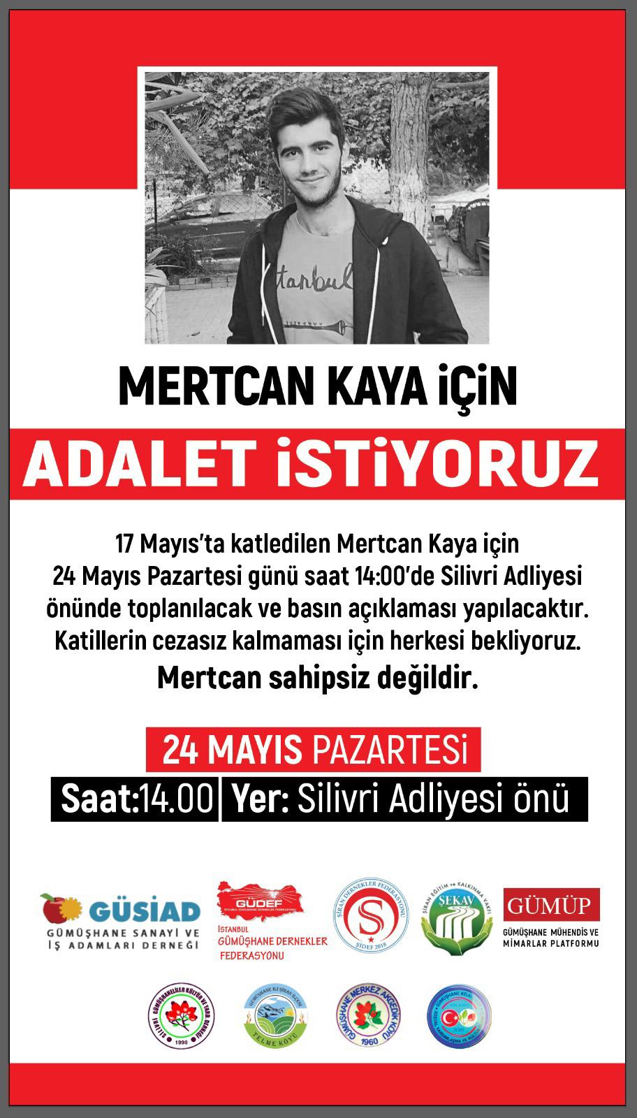 Diğer yandan Mertcan Kaya’ya adalet için 24 Mayıs Pazartesi günü saat 14.00’de Silivri adliyesi önünde basın açıklaması yapılacak.