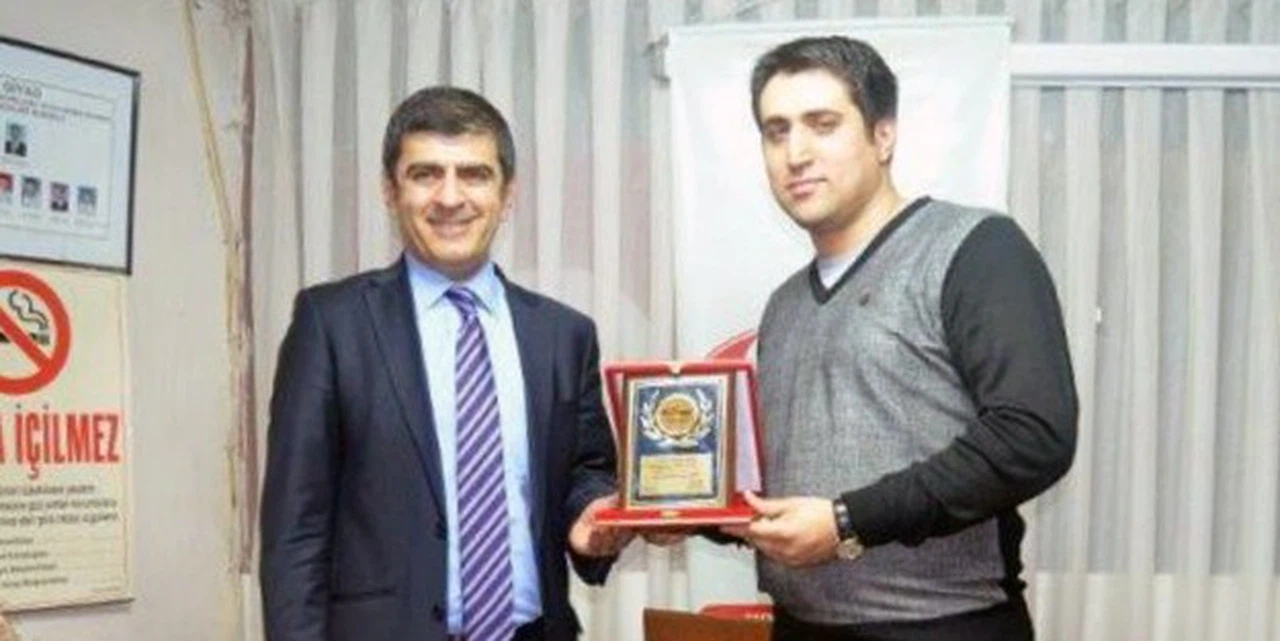 Program sonunda GİYAD Başkanı Serkan Kaya, Profösör Ateş'e plaket takdim etti.
