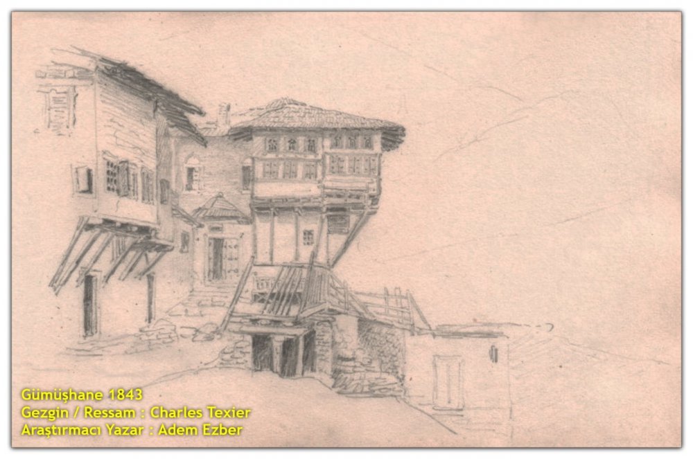 Texier Gümüşhane’den çok etkilemiş olmalı ki (Coğrafi yapısı, maden ocakları, ahşap konakları, vb.) sadece şehrin genelini değil farklı bir detayını da resmetmişti. Bu vesile ile ulaştığım Gümüşhane Konağı gravürünü sizlerle paylaşıyorum.