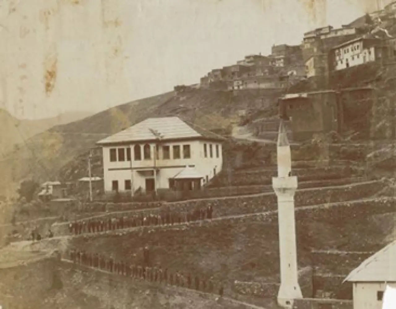 Hepimizin "Dere Camisi" olarak bildiği yapı, hemen yanındaki Rüştiye Mektebi ve önlerinde sıralanmış iki sınıf dolusu öğrenci... Biz bu sahneyi aslında bir kartpostal görüntüsü olarak tanıyorduk. Ancak bu fotoğrafa her baktığımda aklımı kurcalayan bir soru vardı: Bu fotoğraf tam olarak nereden çekilmişti? Zira bu açıyı yakalamak için karşı yamaç çok uzak kalıyor, mevcut coğrafi şartlar bu perspektifi açıklamaya yetmiyordu. Arşivimize eklediğimiz yeni ve yüksek detaylı fotoğraf, bu gizemi tamamen ortadan kaldırdı.