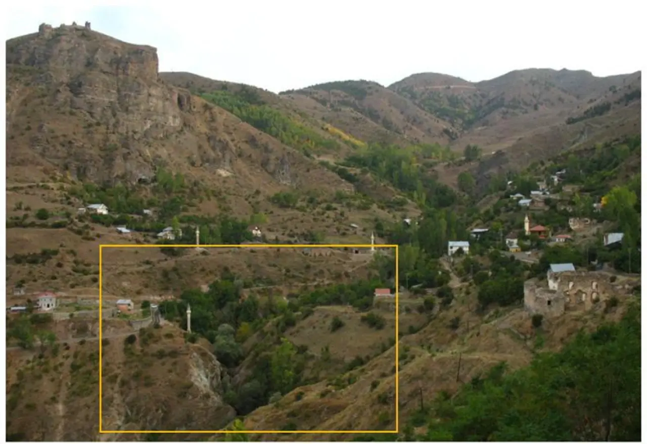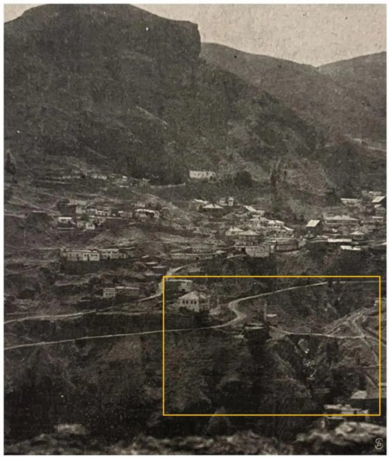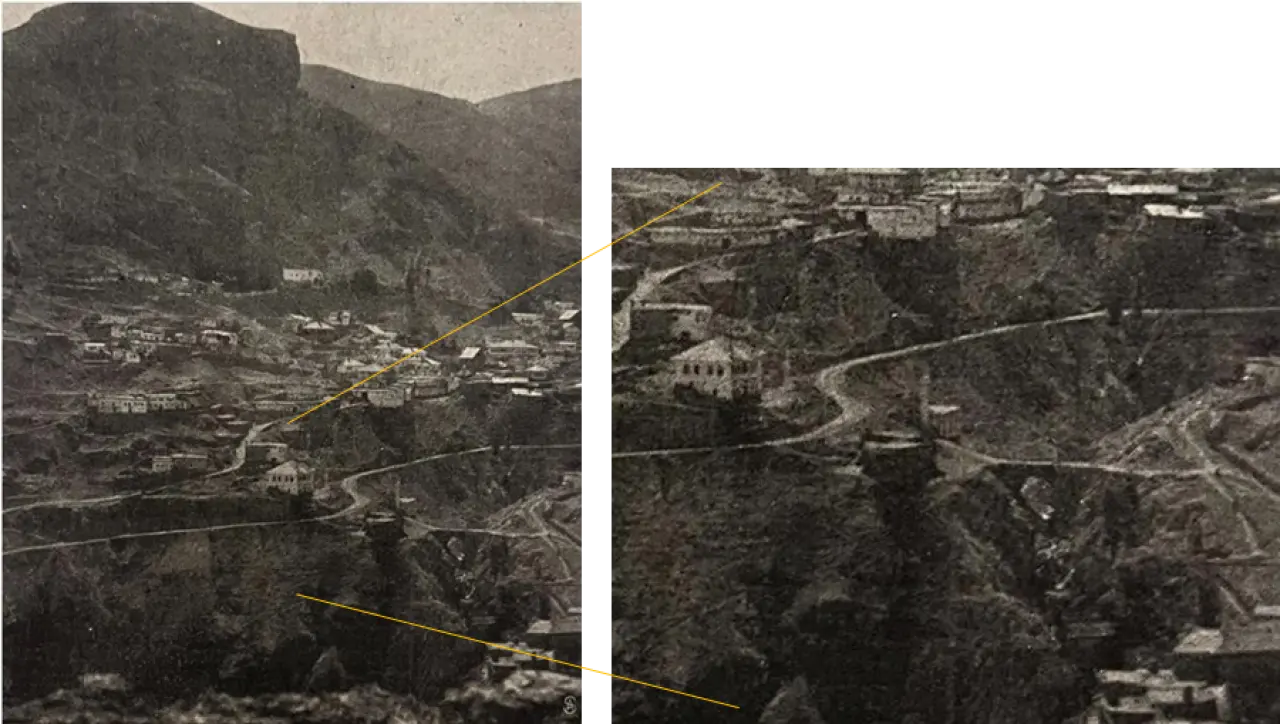 Sosyal medyada paylaşılan bu yeni görsel, belki de birçoğumuzun bilmediği, sadece büyüklerimizin anlatılarında kalan bir gerçeği gün yüzüne çıkardı. Fotoğrafın detaylarında (sarı kare ile işaretlediğimiz alanda) Rüştiye Mektebi, Dere Camisi ve Ermeni mahallesinden bazı evler net bir şekilde görülüyor. Ancak asıl sürpriz, bu iki yakayı birbirine bağlayan, bugüne ulaşamamış o yol ve köprüdür.