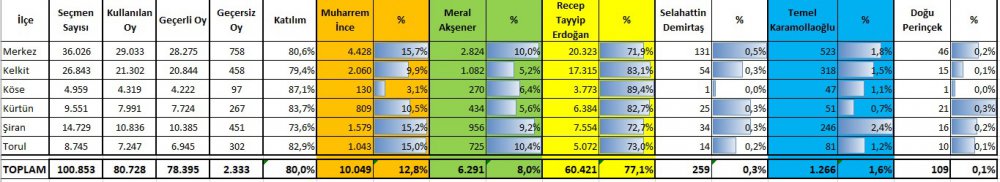 Gümüşhane'de 24 Haziran tarihinde yapılan Cumhurbaşkanlığı seçimi ilçe bazlı kesin olmayan resmi sonuçlar.