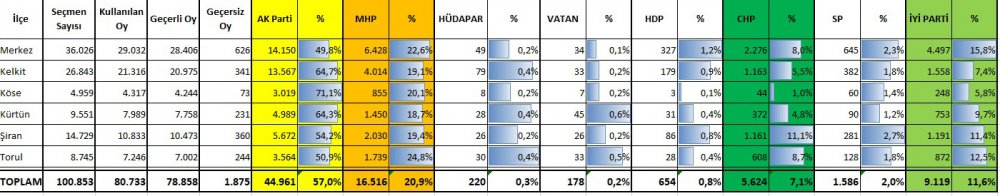 Gümüşhane'de 24 Haziran tarihinde yapılan 27.dönem Milletvekili seçimi ilçe bazlı kesin olmayan resmi sonuçlar.
