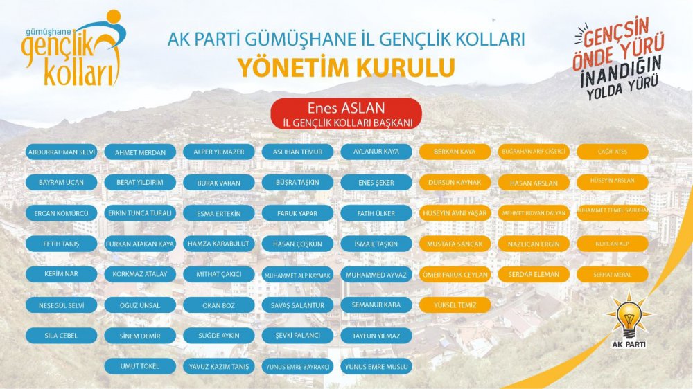 Aslan’ın başkanlığında AK Parti Gümüşhane İl Gençlik Kolları Yönetim kurulunda şu isimler yer aldı: