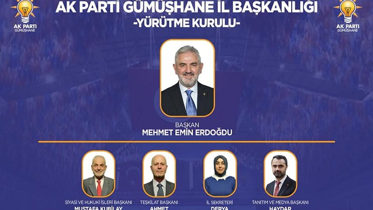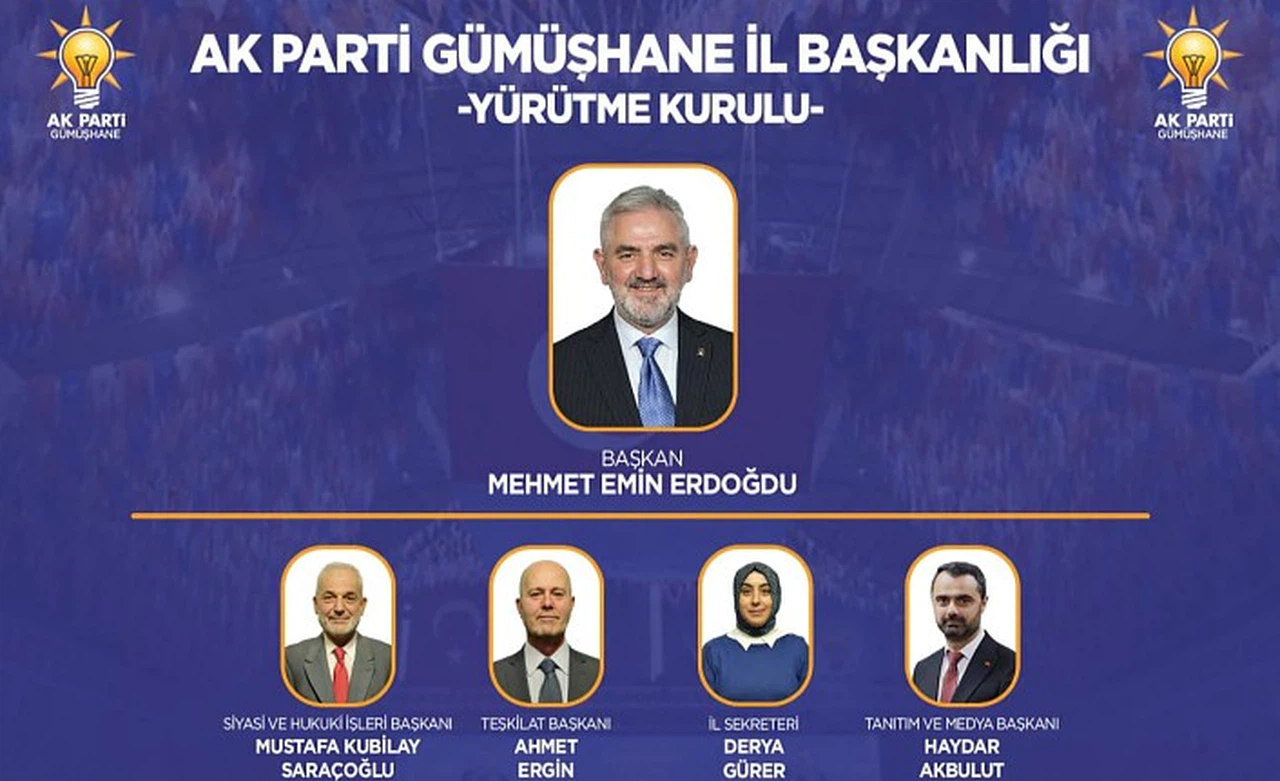 Açıklanan AK Parti Gümüşhane İl Başkanlığı Yürütme Kurulunda Siyasi ve Hukuk İşleri Başkanlığına Mustafa Kubilay Saraçoğlu, Teşkilat Başkanlığına Ahmet Ergin, İl Sekreterliğine Derya Gürer, Tanıtım ve Medya Başkanlığına Haydar Akbulut, Dış İlişkiler Başkanlığına Hayati Akbağ, Seçim İşleri Başkanlığına Mustafa Zülfikaroğlu, Yerel Yönetimler Başkanlığına Mehmet Yalçın, Ekonomi İşleri Başkanlığına Mesut Çimen, Bilgi ve İletişim Teknolojileri Başkanlığına Derya Ezber, Mali ve İdari İşler Başkanlığına Abdülkerim Örkmez, ARGE Başkanlığına Zeki Ünsal, İnsan Hakları Başkanlığına Basri Özdamar, Çevre, Şehir ve Kültür Başkanlığına Esengül Aslan, Sivil Toplum ve Halkla İlişkiler Başkanlığına Sebahattin Nas, Sosyal Politikalar Başkanlığına Yılmaz Döner getirildi.