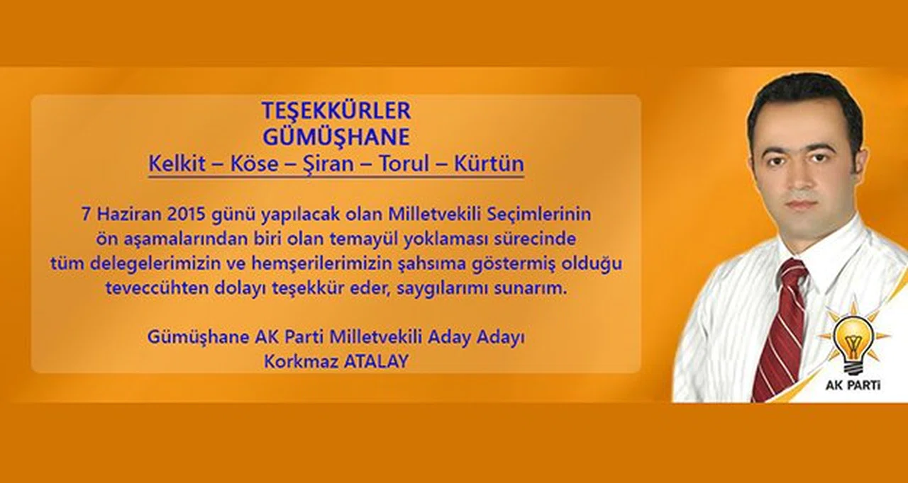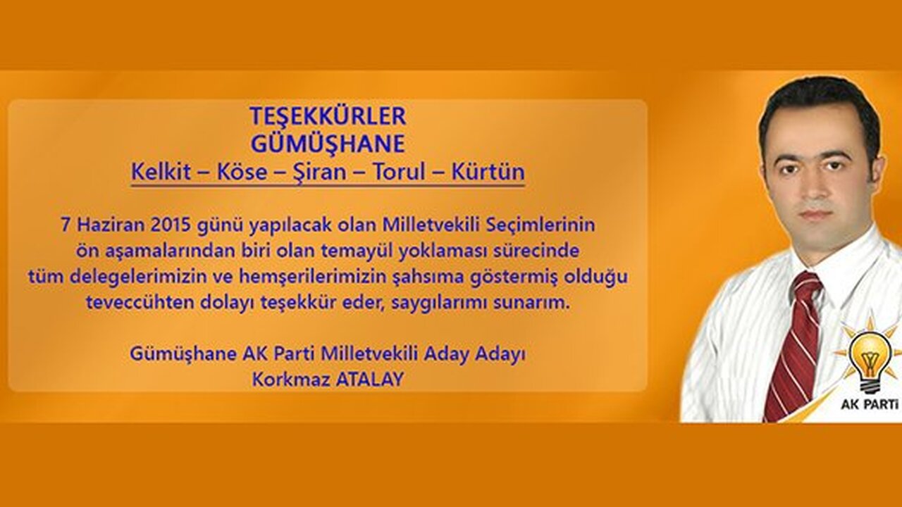AK Parti 25.dönem Gümüşhane Milletvekili Aday Adayı Korkmaz Atalay, 1 Mart 2015 tarihinde gerçekleştirilen temayül yoklamasının ardından teşekkür mesajı yayınladı.