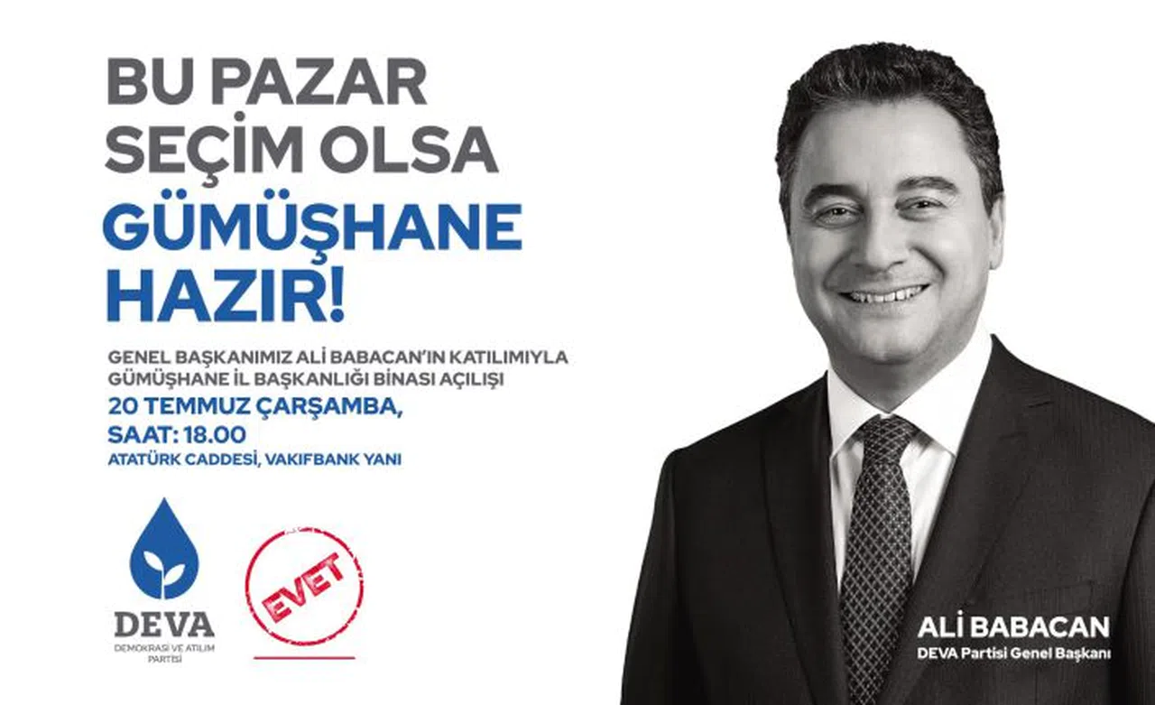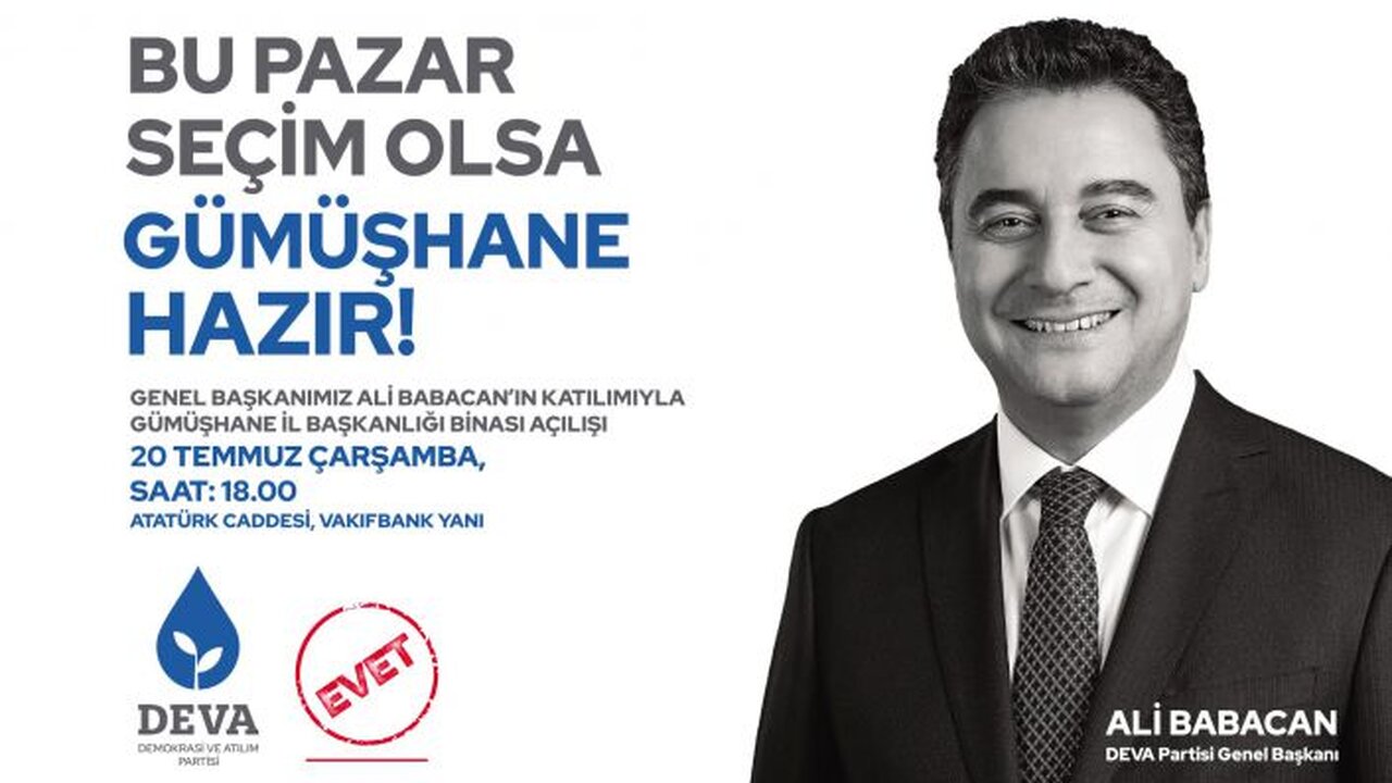 DEVA Partisi Genel Başkanı Ali Babacan, bir dizi programa katılmak üzere 20 Temmuz Çarşamba günü Gümüşhane'de olacak.
