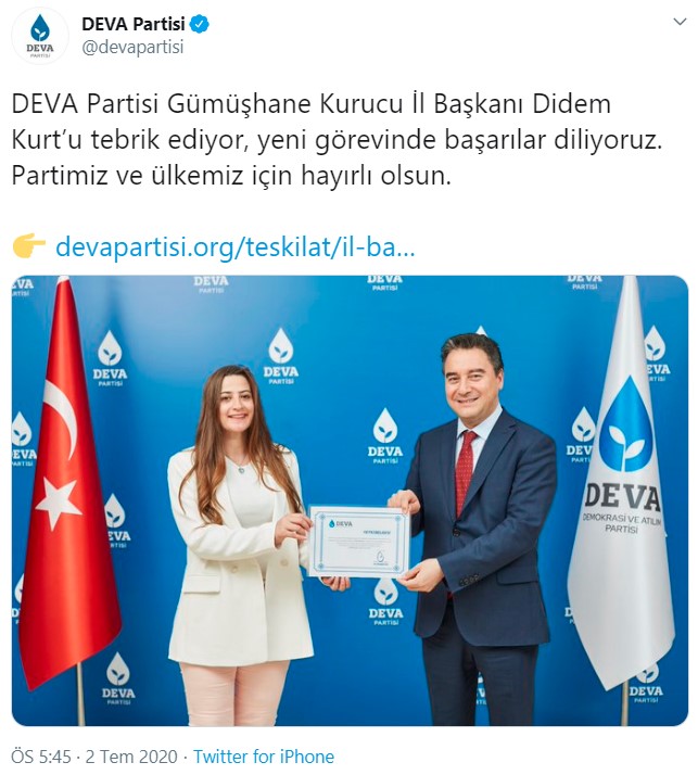AK Parti iktidarlarında Dışişleri Bakanlığı, ekonomiden sorumlu Devlet Bakanlığı, Başbakan Yardımcılığı görevleri yürüten ve partisinden istifa ederek DEVA Partisi'ni kuran Ali Babacan, Gümüşhane İl Başkanı Didem Kurt'un yetki belgesini de kendi elleriyle parti genel merkezinde verdi.