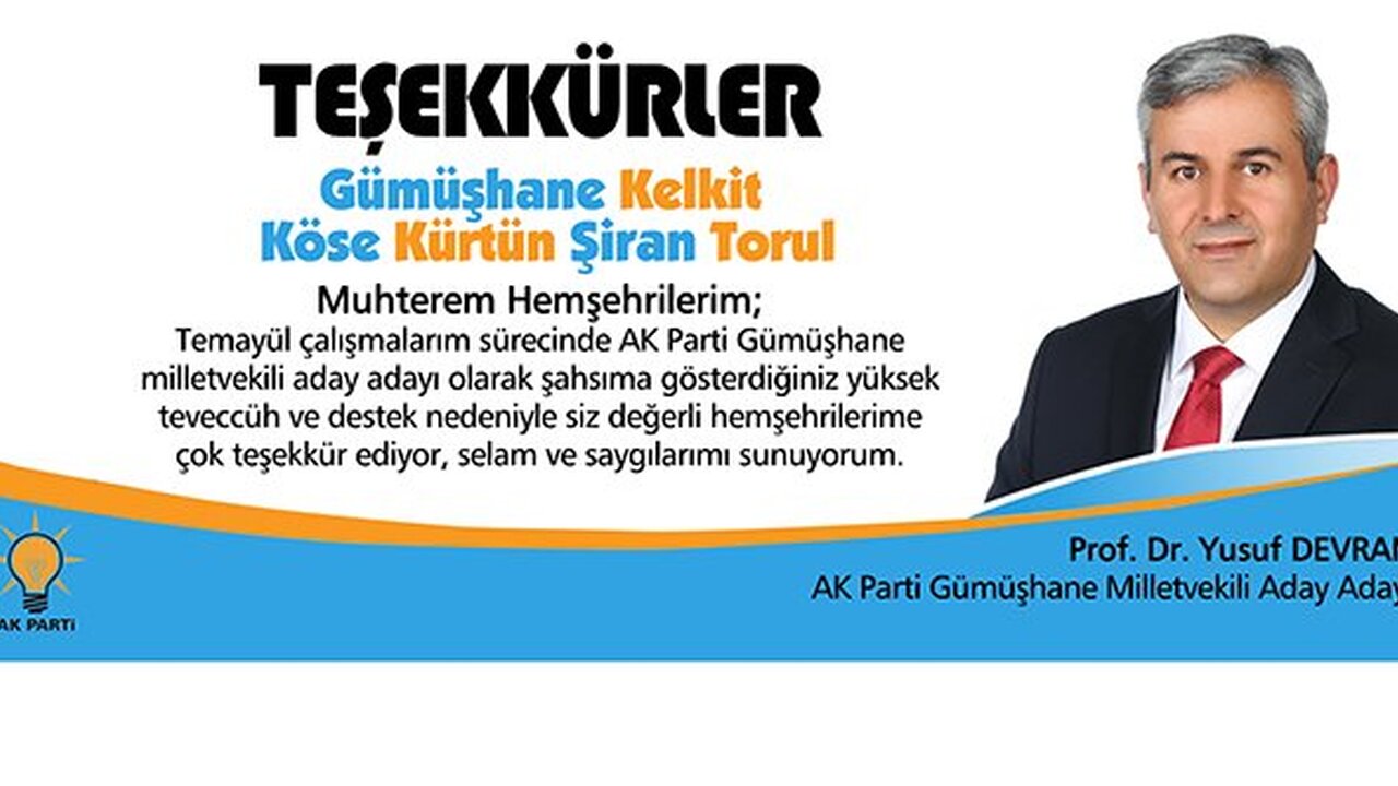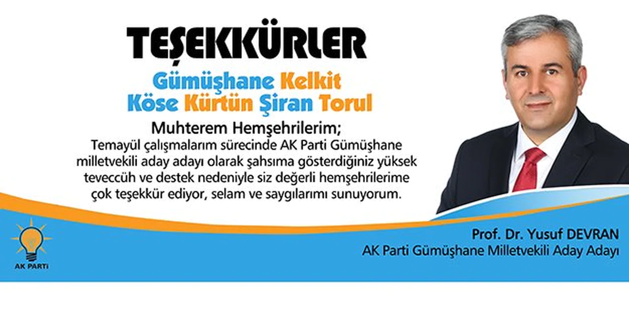 AK Parti Gümüşhane Milletvekili aday adayı Prof.Dr. Yusuf Devran, temayül yoklamasının ardından teşekkür mesajı yayımladı.