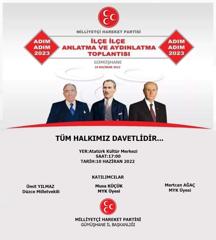 MHP Düzce Milletvekili Ümit Yılmaz ve MYK üyeleri Musa Küçük ve Mertcan Ağaç’tan oluşan heyet 10-11-12 Haziran tarihlerinde Gümüşhane merkez ve diğer ilçelerde esnaf ziyaretleri ve salon toplantıları yapacak.
