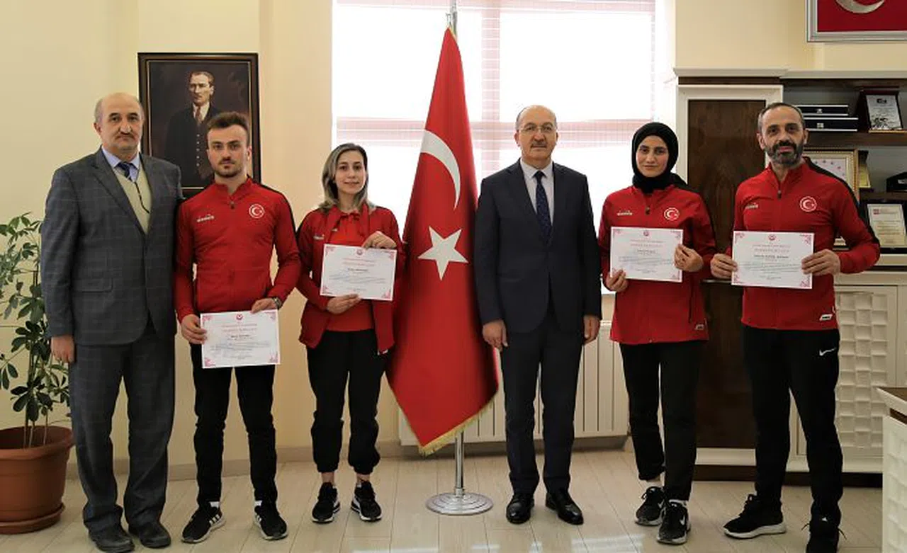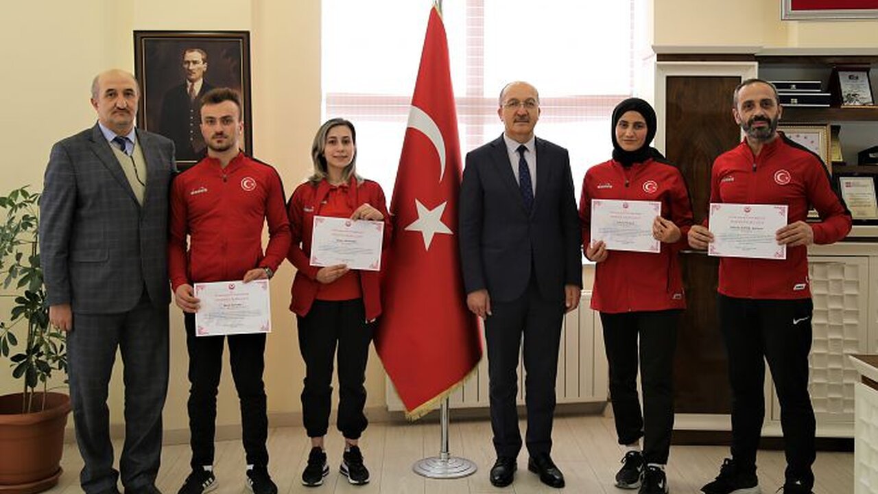 Ziyaret sonrasında Rektör Zeybek tarafından Antrenör Davut Altuntaş ile sporcular Şükriye Yılmaz, Berat Yıldırım ve Büşra Kandemir’e başarılarından dolayı teşekkür belgesi takdim edildi.