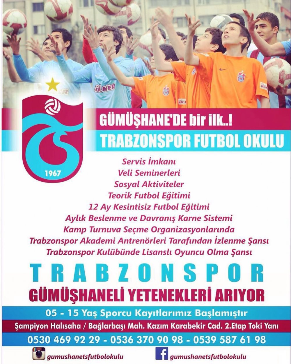 Servis imkanı, veli seminerleri, sosyal aktiviteler, teorik futbol eğitimi, 12 ay kesintisiz futbol eğitimi, aylık beslenme ve davranış karne sistemi, kamp turnuva seçme organizasyonlarında Trabzonspor akademi antrenörleri tarafından izlenme şansı ve Trabzonspor kulübünde lisanslı oyuncu olma şansı tanıyan futbol okuluna kayıt olmak için 0 530 469 92 29, 0 536 370 90 98 ve 0 539 587 61 98 numaralı telefonlardan bilgi alabilirsiniz.
