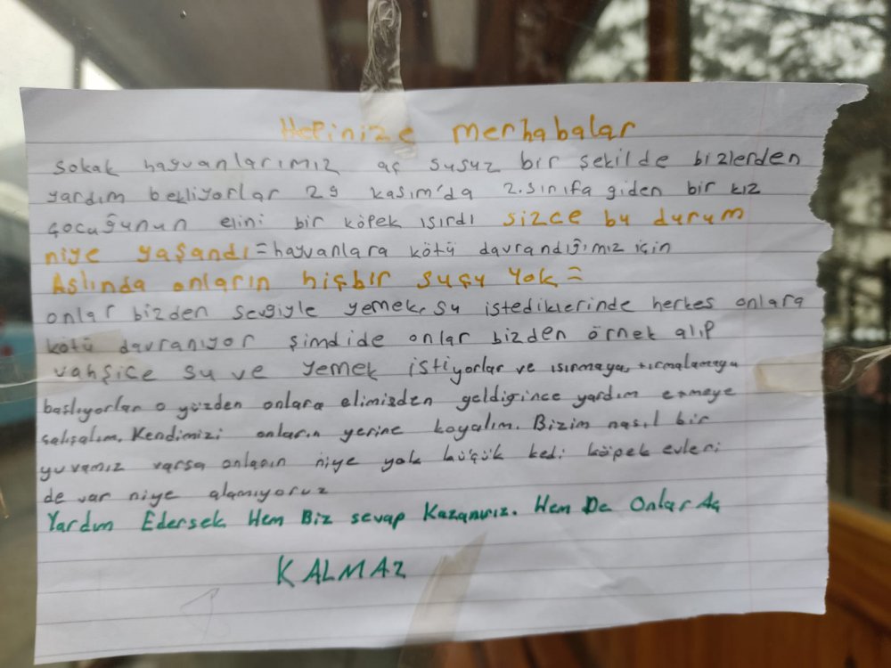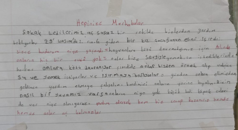 Sokak hayvanlarına önem veren insanlarımıza teşekkürümüz çoktur. Sokak kedilerimiz aç susuz bir şekilde bizlerden yardım bekliyorlar. 29 Kasım’da ikinci sınıfa giden bir çocuğun elini ısırdı. Sizce bu durum niye yaşandı. Hayvanlara kötü davrandığımız için. Aslında onların hiçbir suçu yok. Onlara sevgiyle yemek ve su verirsek onlar bize kötülük etmez ki. Herkes onlara kötü davranırsa onlarda bizi ısırır. Kendimizi onlar yerine koyalım. Bizim nasıl bir yuvamız var onların ise yok. Küçük köpek ve kedi evleri yapalım. Hem biz sevap kazanırız hem de onlar aç susuz kalmazlar.