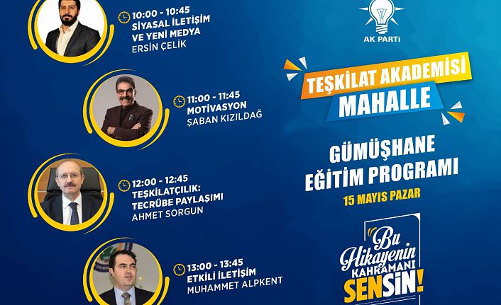 Bir gün sürecek olan eğitim programlarında önemli isimler Gümüşhane’ye gelecek. Programda Ahmet Sorgun tarafından "Teşkilatçılık; Tecrübe Paylaşımı", Muhammet Alpkent tarafından "Etkili İletişim", Ersin Çelik tarafından "Siyasal İletişim ve Yeni Medya" ve Şaban Kızıldağ tarafından "Motivasyon" konularında etkinlikler gerçekleştirecek.