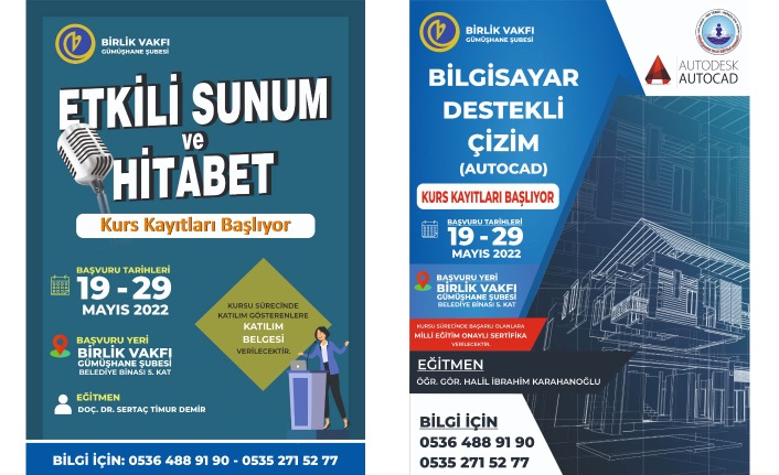 Birlik Vakfı Gümüşhane Şubesi, pandeminin ardından yüz yüze yapılacak iki ayrı kurs açıyor. Doç. Dr. Sertaç Timur Demir tarafından verilecek Etkili Sunum ve Hitabet ve Öğr. Gör. Halil İbrahim Karahanoğlu tarafından verilecek Bilgisayar Destekli Çizim (AutoCad) kurslarına kursiyerler ücretsiz olarak katılabilecek. Kursiyerlere eğitimlerin ardından katılım belgesi ve Milli Eğitim onaylı sertifika verilecek.