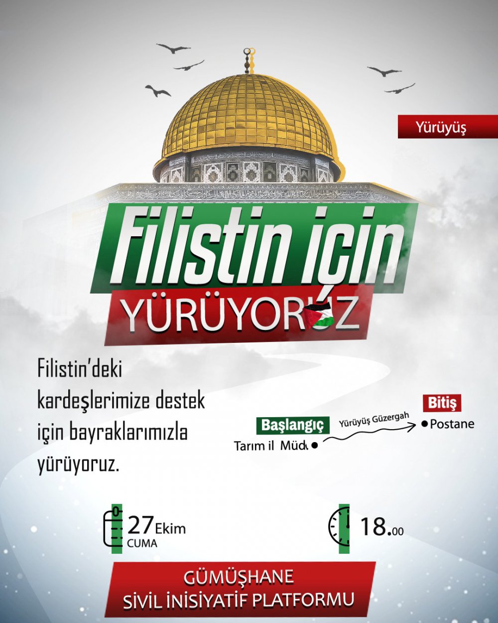 Gümüşhane Sivil İnisiyatif Platformu tarafından "Filistin için yürüyoruz" sloganıyla düzenlenecek etkinlik 27 Ekim Cuma günü saat 18.00'da başlayacak.