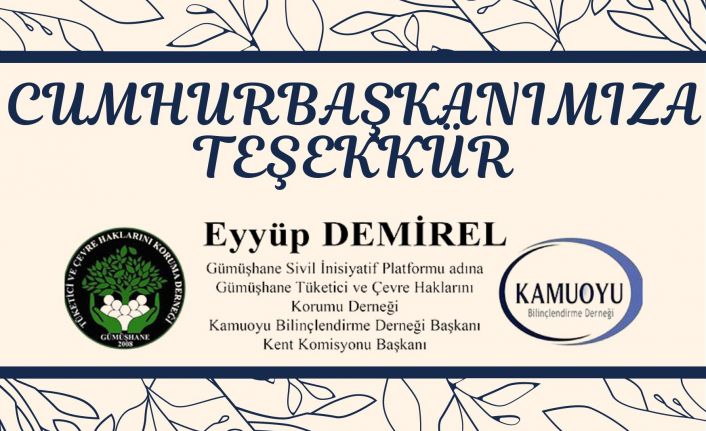 Sivil Toplum Kuruluşlarının taleplerini dikkate alıp Gümüşhanemize ve bölgemize proje, yatırım ve desteklerinden dolayı CUMHURBAŞKANIMIZ SAYIN RECEP TAYYİP ERDOĞAN'a Gümüşhane halkı ve tüm Sivil Toplum Kuruluşları adına teşekkürlerimizi sunarız.