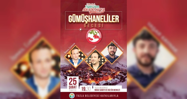 25 Şubat tarihinde Tuzla Belediyesi Nikah ve Kültür Sarayında Tuzla Gümüşhaneliler Derneğinin düzenleyeceği programa sanatçılar Yaşar Kaynak, İsmail Cumhur ve Özkan Pekin katılacak.