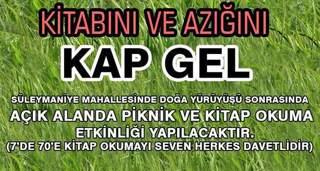 "Kitabını ve azığını kap gel" sloganıyla gerçekleştirilecek olan ve 7'den 70'e kitap okumayı seven herkesin davetli olduğu etkinlikte havanın uygun olması durumunda doğa yürüyüşü, açık alanda piknik ve kitap okuma etkinliği yapılacak.