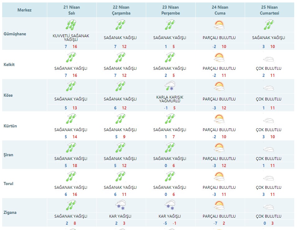 Tahminlere göre Salı ve Çarşamba günleri Gümüşhane çevrelerinde kuvvetli sağanak yağış, Çarşamba günü bin 500 metre üzeri yüksek kesimlerde karla karışık yağmur ve kar şeklinde olacağı tahmin ediliyor.