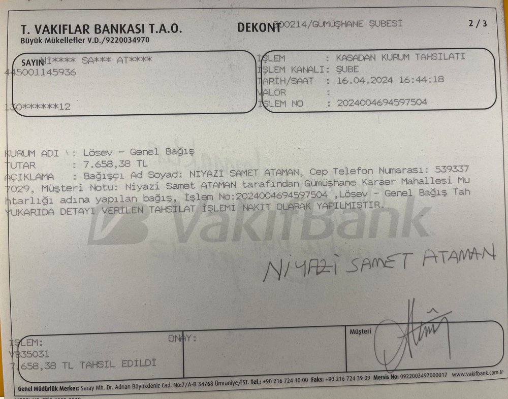 Gümüşhane kent merkezinin 14 mahallesinin en genç muhtarı olan Karaer Mahallesi muhtarı Niyazi Samet Ataman, söz verdiği gibi ilk maaşını LÖSEV’e bağışladı.