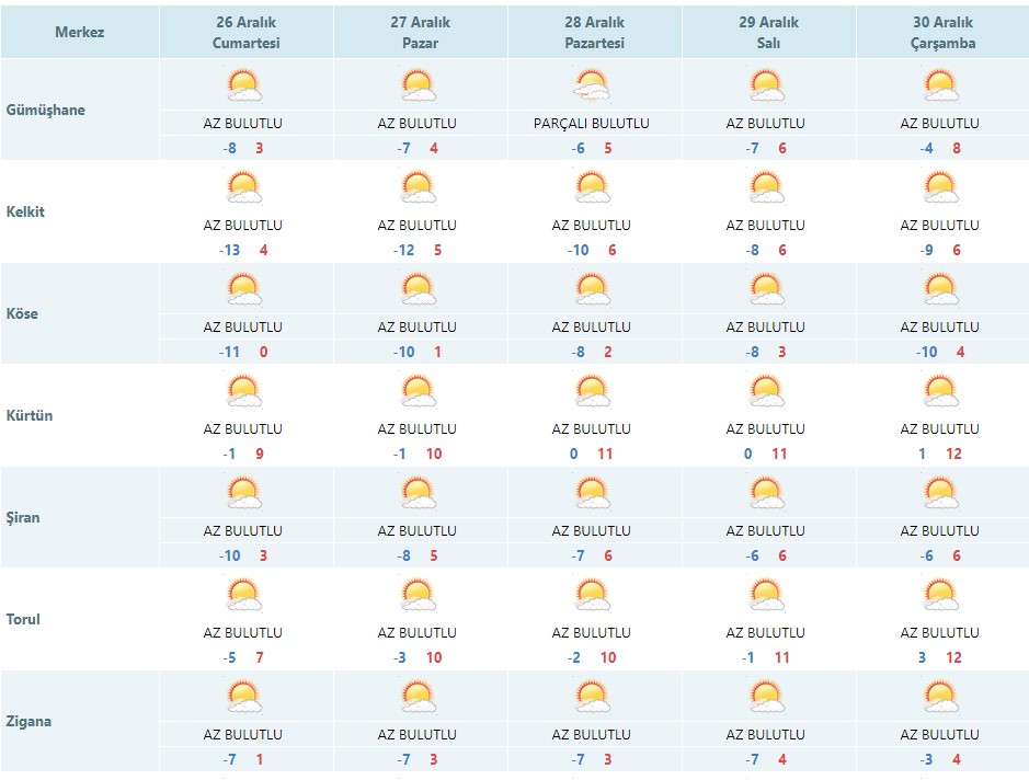 Diğer yandan son meteorolojik değerlendirmelere göre Gümüşhane’de önümüzdeki beş gün boyunca yağış beklenmiyor. Güneşli havanın hüküm süreceği Gümüşhane’de hava sıcaklıkları geceleri eksi derecelerde olmaya devam edecek, gündüzleri de artı 8 derecelere kadar yükselecek.