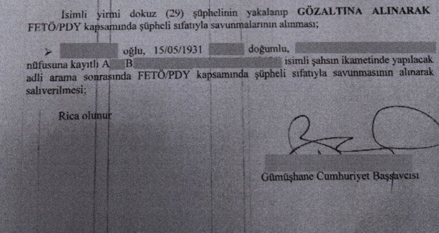 Açıklamada Cumhuriyet Başsavcısı imzasıyla 1931 doğumlu A.B'nin FETÖ/PDY soruşturması kapsamında ikametinde yapılacak adli aramanın ardından şüpheli sıfatıyla savunmasının alınarak salıverilmesi konusunda ki Cumhuriyet Başsavcısı imzalı belge de de yayımlandı.
