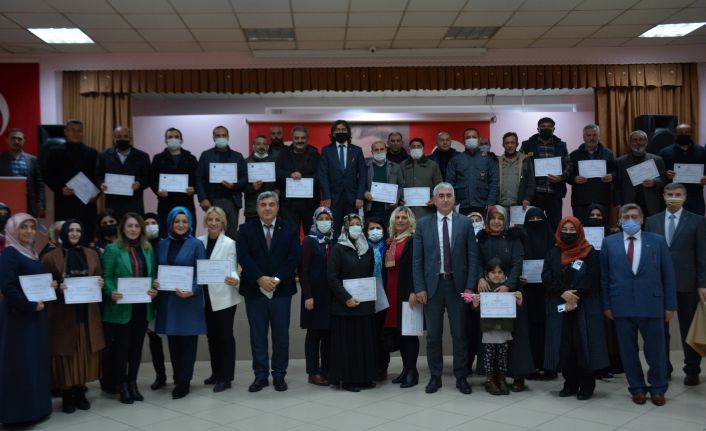 Halk Eğitimi Merkezi tarafından İl Milli Eğitim Müdürlüğü ve Tarım ve Orman İl Müdürlüğü’nün de destekleriyle açılan Kilim Dokuma, Tıbbi ve Aromatik Bitki Üreticiliği ve 2 adet Arıcılık kursu olmak üzere toplam 4 kursta eğitim gören 93 kursiyer için Halk Eğitimi Merkezi Salonunda sertifika töreni düzenlendi.