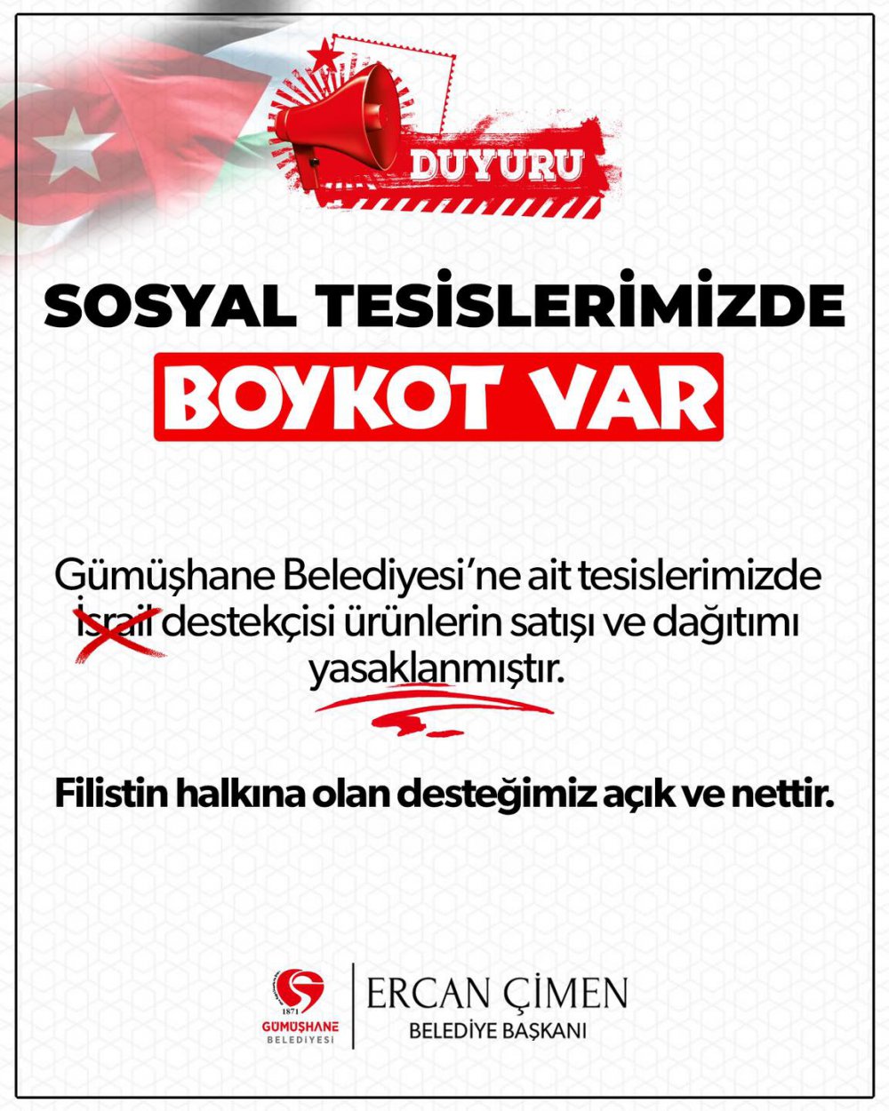 Belediye Başkanı Ercan Çimen, sosyal medya hesabından yaptığı açıklamada Belediyeye ait sosyal tesislerde boykot uygulamaya başladıklarını belirterek “Gümüşhane Belediyesine ait tesislerimizde İsrail destekçisi ürünlerin satışı ve dağıtımı yasaklanmıştır. Filistin halkına olan desteğimiz açık ve nettir. Zalimliğe ve haksızlığa karşı duruşumuz net” ifadelerini kullandı.