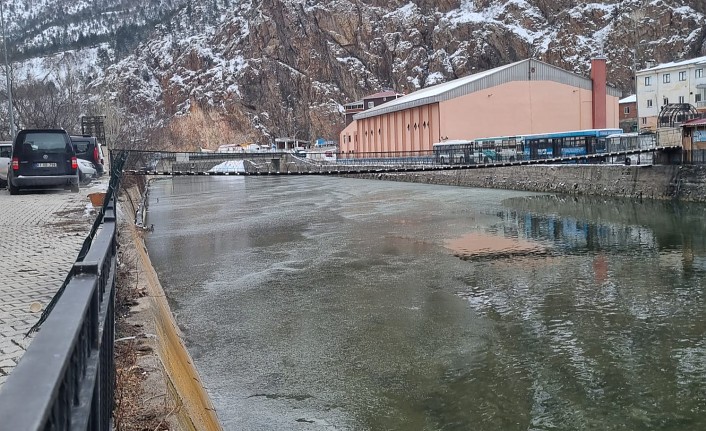 Türkiye’nin en hızlı akan çaylarından Harşit Çayı da soğuktan nasibini alırken Torul ilçesi sınırlarında biriktirme yapılan noktalarda Harşit Çayının yüzeyi buz tuttu.