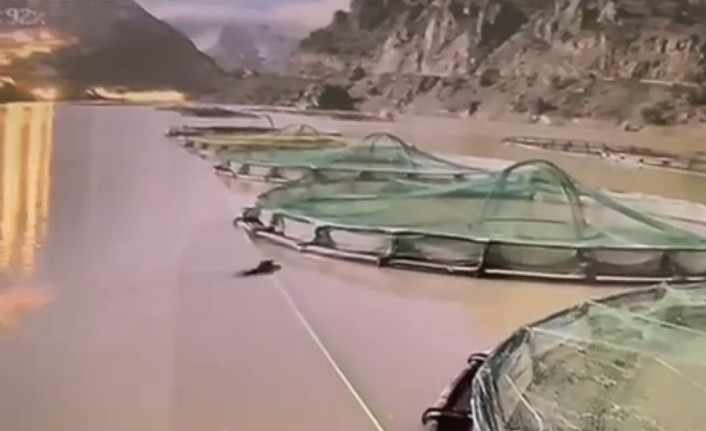 Gümüşhane'de gündüz vakti somon üretim tesisine girerek balıkları yiyen aç ayı kameralara yakalandı.