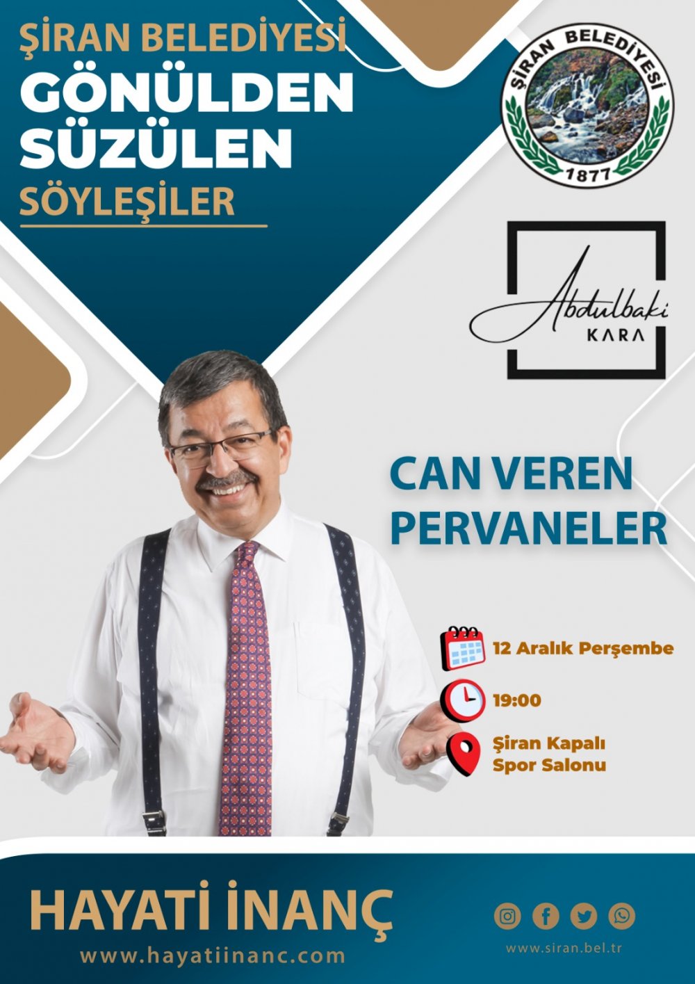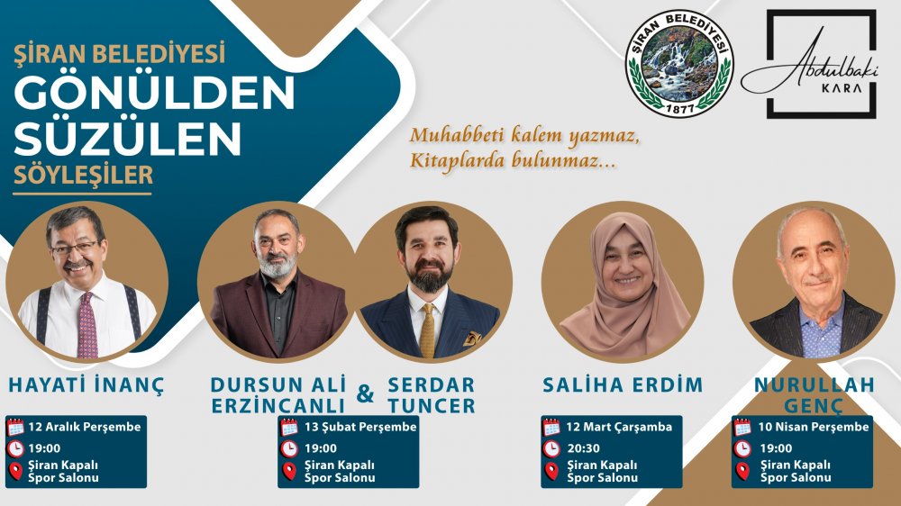 Bu etkinliklere oldukça önem verdiklerini belirten Kara “Şiran Belediyesi olarak Gönülden Süzülen Söyleşiler etkinlikleri ile birbirinden kıymetli isimleri hemşerilerimizle buluşturmayı hedefliyoruz. Etkinliğimizin ilk programı olarak yazar ve edebiyatçı, söz üstadı kıymetli gönül insanı Sayın Hayati İnanç’ı Şiran’da hemşerilerimizle buluşturuyoruz. 12 Aralık Perşembe günü saat 19:00 da Şiran Kapalı Spor salonunda yapılacak olan programımıza bütün hemşerilerimizi bekliyoruz. Bu etkinlikleri oldukça önemsiyoruz. Bu yüzden birbirinden kıymetli isimleri Aralık, Ocak, Şubat, Mart ve Nisan ayında olmak üzere 5 farklı programda hemşerilerimizle buluşturma hedefimiz var. Açılışı Hayati İnanç hocamızla yapıp devamında Ahmet Şerif İzgören, Serdar Tuncer, Dursun Ali Erzincanlı, Saliha Erdim ve Nurullah Genç gibi birbirinden değerli isimleri Şiran’a getireceğiz inşallah. Gönülden Süzülen Söyleşiler etkinliklerimiz ile gönüllere dokunmak istiyoruz. Bütün hemşerilerimiz de programımıza bekliyoruz” ifadelerini kullandı.