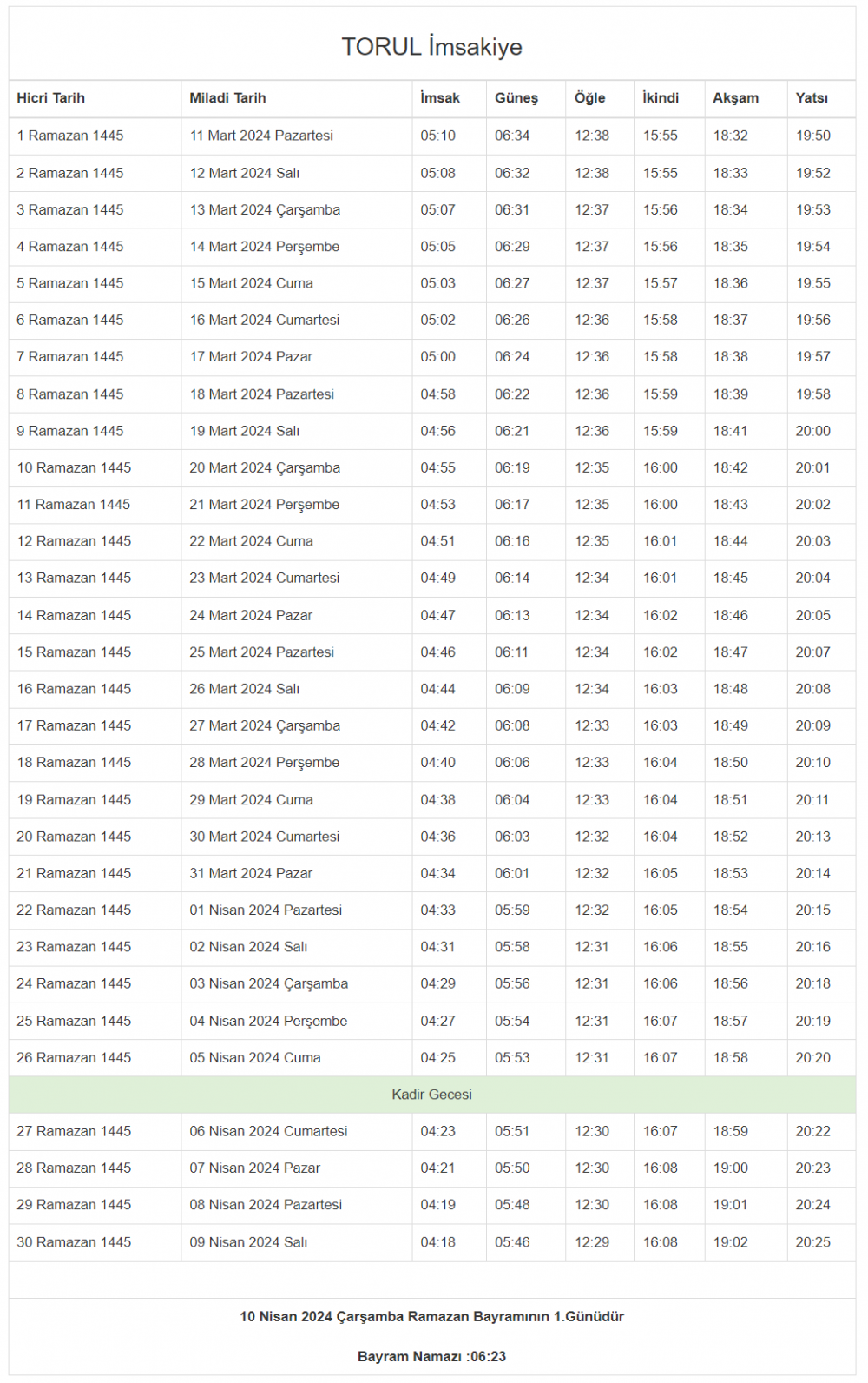 İşte Gümüşhane’nin ilçe ilçe 2024 yılı Ramazan ayı imsakiyesi: