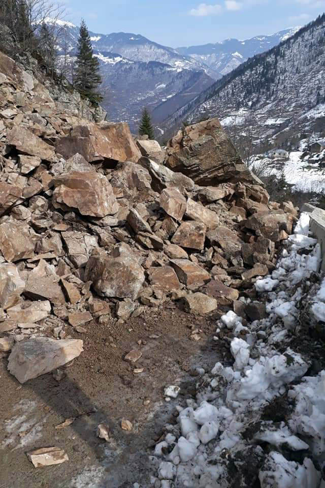 Gümüşhane’nin Kürtün ilçesinde yoğun kar yağışının ardından havaların ısınmasıyla birlikte donma-çözünme olayı sonucu Örümcek Ormanları yolunda heyelan gerçekleşti. Yolu kapatan, beton bariyerleri kıran dev kayalar Çağlayandibi Şelalesi Tabiat parkı tesislerine de zarar verdi.