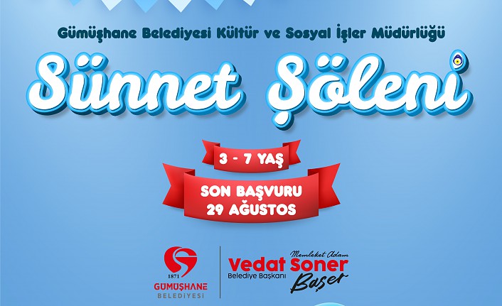Sosyal Belediyecilik anlayışı kapsamında Gümüşhane Belediyesi tarafından ücretsiz olarak düzenlenecek ve 3 ila 7 yaş arasındaki çocukları kapsayacak olan 'Toplu Sünnet Şöleni' başvuruları 29 Ağustos'ta sona erecek.